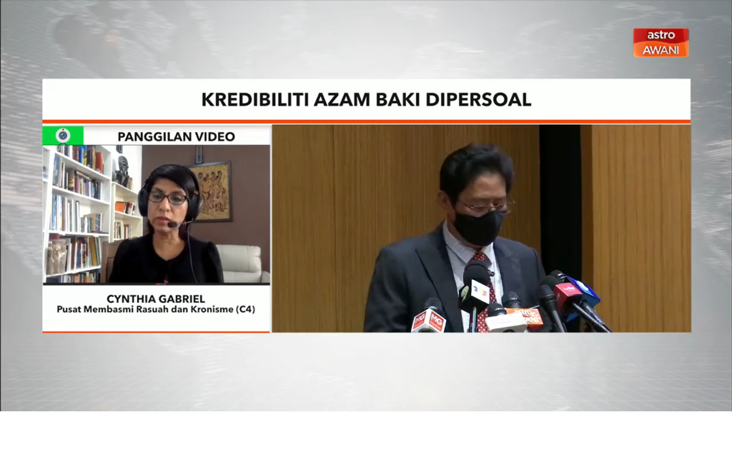 Pengarah Eksekutif Pusat Bagi Memerangi Rasuah dan Kroni (C4) Cynthia Gabriel berkata, penjelasan Ketua Pesuruhjaya Suruhanjaya Pencegahan Rasuah Malaysia (SPRM), Tan Sri Azam Baki mengenai jumlah pemilikan saham yang melampau dibuat semalam masih belum dianggap memadai.